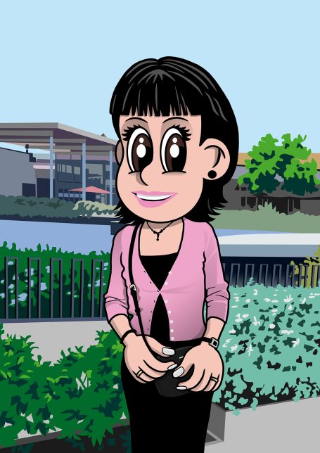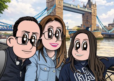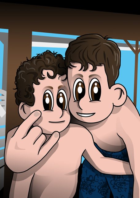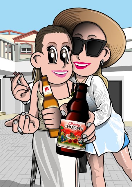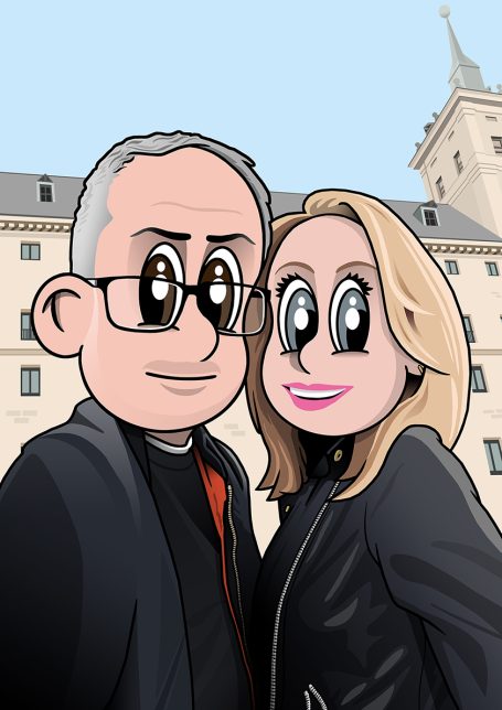 Recreación de una fotografía a base de una original caricatura del protagonista o protagonistas de la misma. Se ilustra el fondo de la foto para conseguir una versión lo más fiel posible al original.
