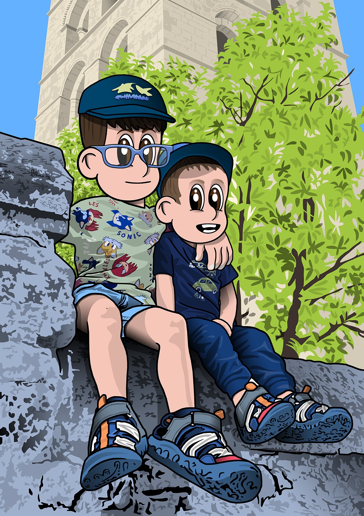 Recreación de una fotografía a base de una original caricatura del protagonista o protagonistas de la misma. Se ilustra el fondo de la foto para conseguir una versión lo más fiel posible al original.